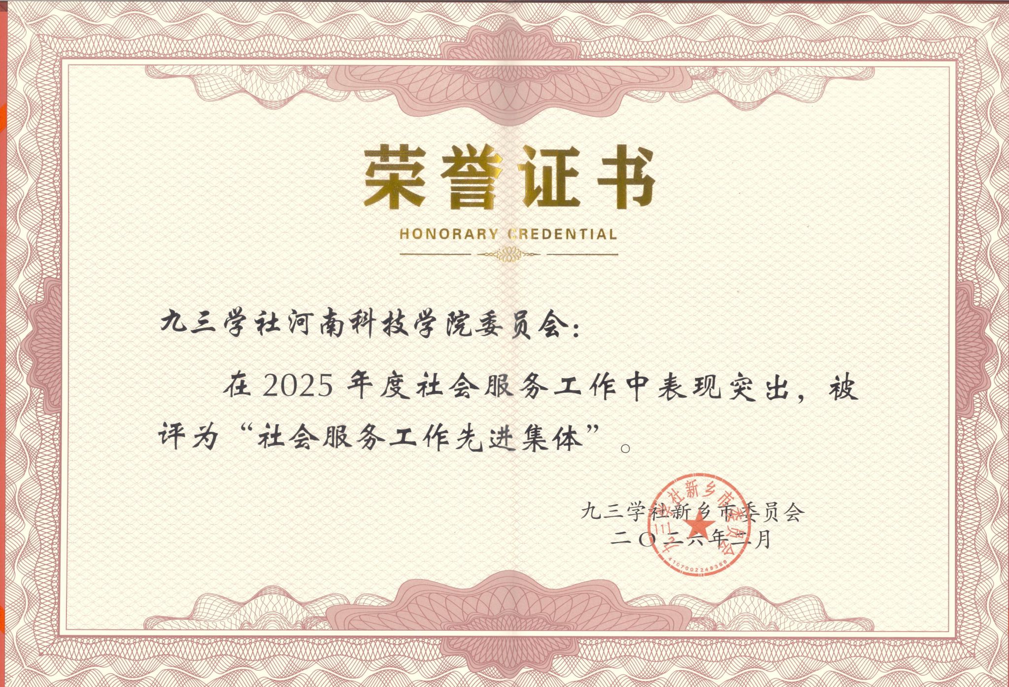 会议表彰了九三学社新乡市委会2025年度社务工作中涌现出的先进集体和个人。我校九三学社委员会被授予“组织工作先进集体”“思想宣传工作先进集体”和“社会服务工作先进集体”荣誉称号,姚素梅、周凯被评为“参政议政工作先进个人”,徐泮被评为“思想宣传工作先进个人”,张安邦、郭建彪、宋普文、王平喜被评为“社会服务工作先进个人”,韩其晟被评为“社情民意信息工作先进个人”。