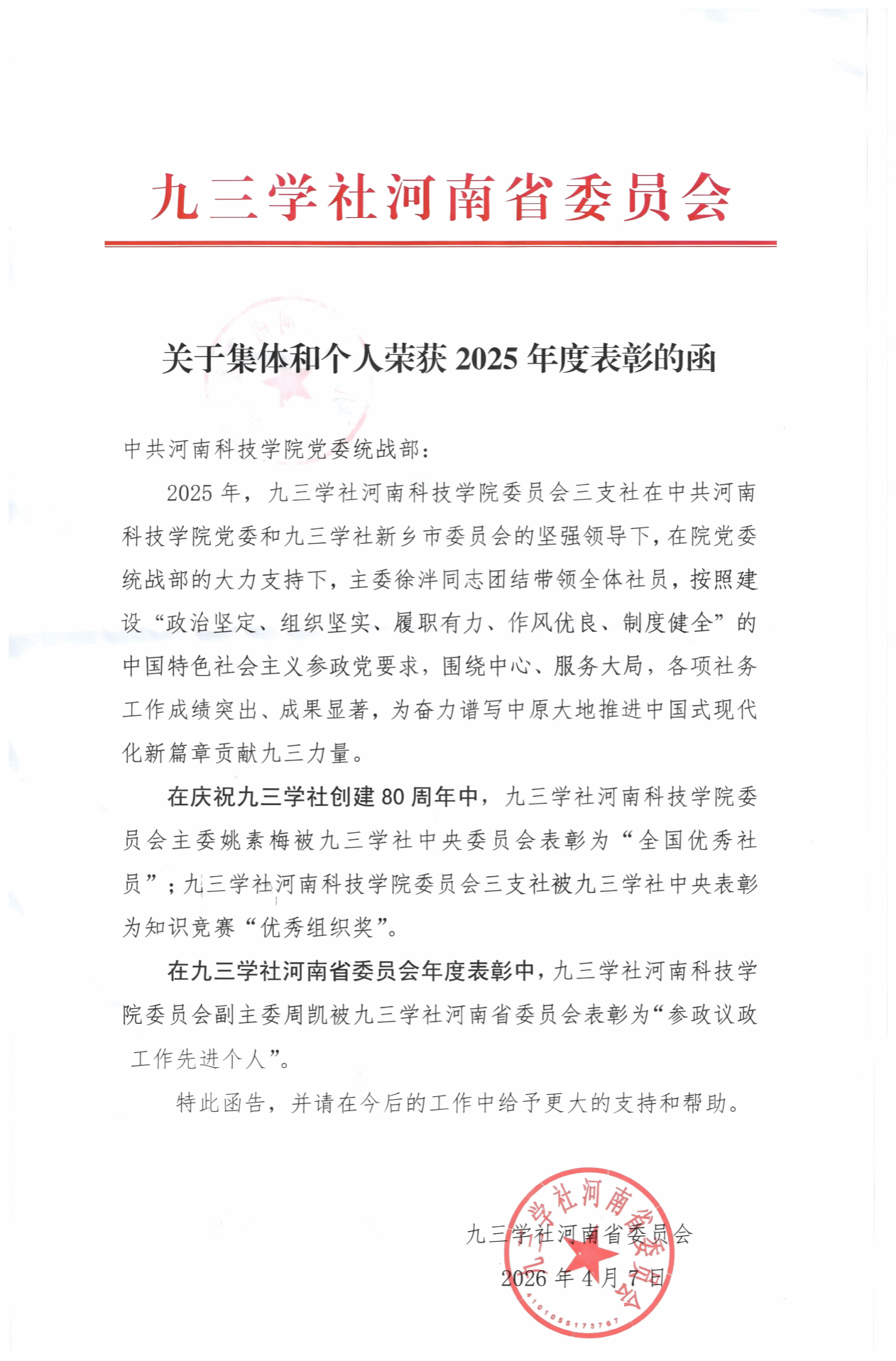 近日,九三学社河南省委员会向我校发函,高度肯定我校九三学社三支社和多名社员在2025年度社务工作中作出的积极贡献,并对他们荣获多项荣誉予以通报。
